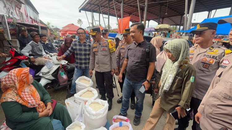 Kapolres Kerinci AKBP Muhamad Mujib bersama jajarannya tampak serius mendatangi para pedagang dan pembeli menanyakan harga sembako.