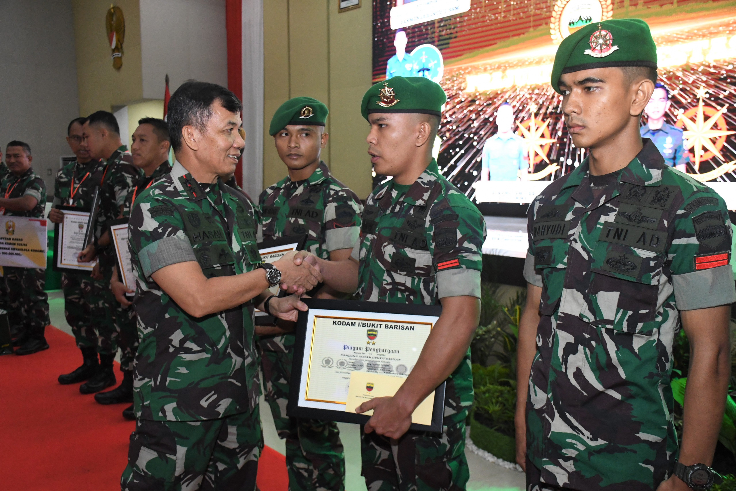 Di kesempatan ini, Pangdam juga memberikan Bantuan Kasad kepada lima Danrem dalam rangka Rehab Swakelola Koramil dan penghargaan kepada prajurit berprestasi di jajaran Kodam I/BB.