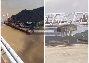 VisualJambi, Kota Jambi. - Viral, beredar video berdurasi 45 detik Kapal Tackboat gandeng bermuatan Batubara menabrak jembatan aurduri 1 hingga...