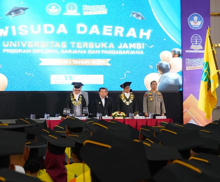 VisuaLJambi, Jambi. – Gubernur Jambi Dr. H. Al Haris, S.Sos, MH menyampaikan ucapan terima kasih dan penghargaan yang tinggi kepada Universitas Terbuka (UT) Jambi atas peran serta dan kontribusinya dalam meningkatkan kualitas Sumber Daya Manusia (SDM). Sebagai pelopor pendidikan jarak jauh, UT berupaya agar pendidikan tinggi bisa dinikmati secara merata, tanpa terhalang jarak dan inilah yang dicetuskan atau konsep Merdeka Belajar sudah ada dari UT. Hal tersebut disampaikan Gubernur saat menghadiri Wisuda Daerah Universitas Terbuka (UT) Jambi Program Diploma, Sarjana dan Pascasarjana Lulusan Periode I Tahun Akademik 2023/2024, bertempat di Gedung Abadi Convention Center, Kota Jambi, Rabu, (15/05/2024) pagi.