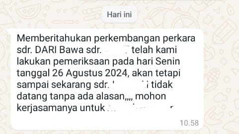Akan tetapi, ada satu nama lagi inisial K yang harus ikut terpanggil, ternyata belum ada memenuhi panggilan hingga saat ini,” Ujar Haris selaku adik kandung DARI saat mendapatkan informasi pesan whatsapp dari kanit Reskrim Polsek linggo sari baganti.