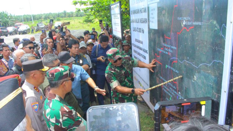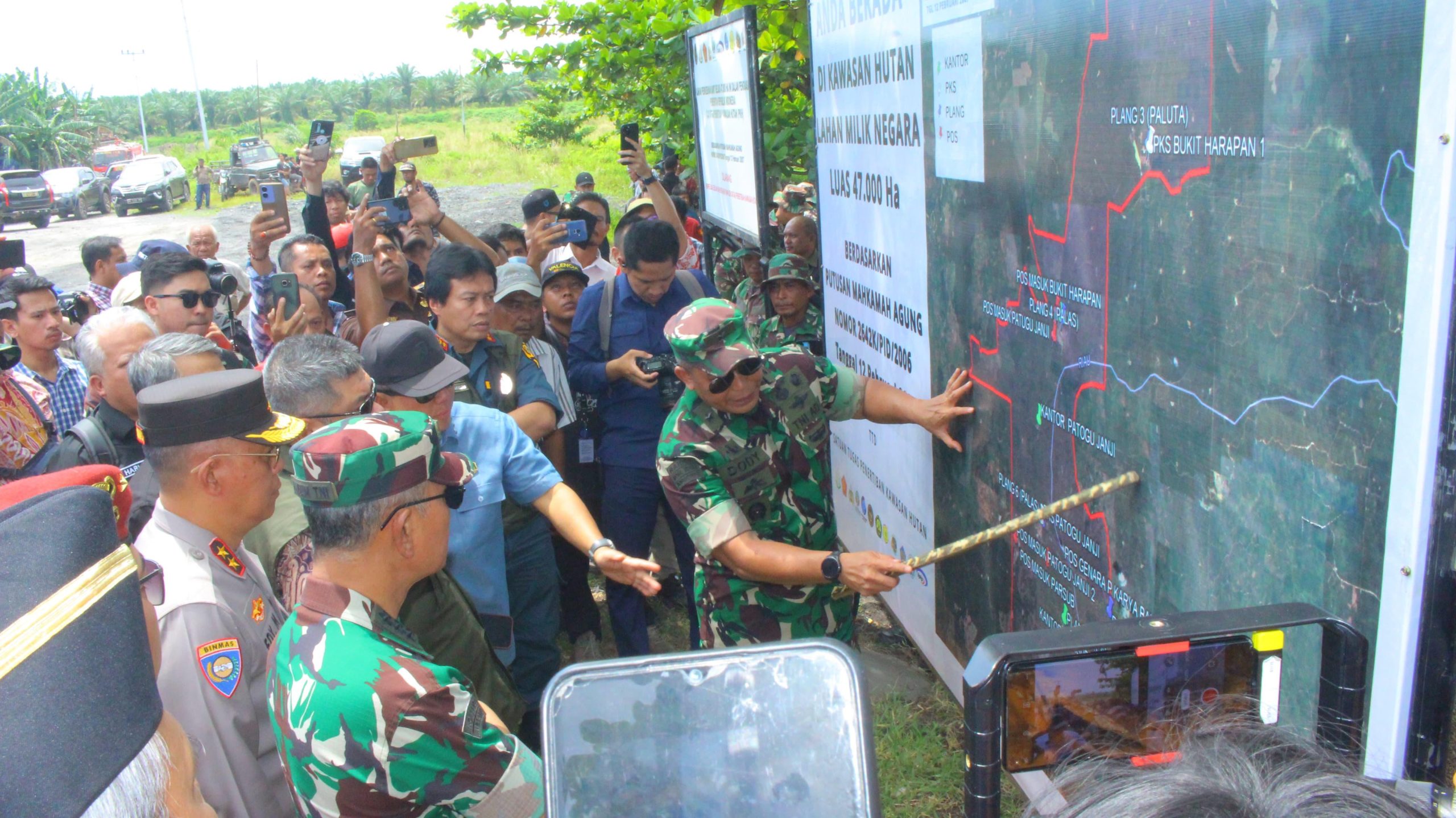 Di Lapangan Bola PT Torganda, Kasum TNI menerima paparan dari Wadan Satgas PKH, Brigjen TNI Doddy Tri Winarto, terkait peta lahan seluas kurang lebih 47.000 hektare yang akan diserahkan kepada Satgas PKH.
