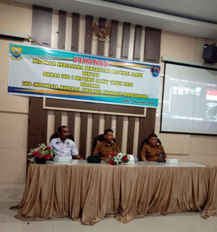 VisualJambi, Kota Jambi. – Seminar dalam rangka kerjasama pemerintah Provinsi Jambi dengan Ormas IWO I Indonesia Provinsi Jambi tahun 2024 bersama IWO Indonesia menjaga Elegansi Jurnalist Profesional berjalan dengan sukses di Aula Kesbangpol Provinsi Jambi.
