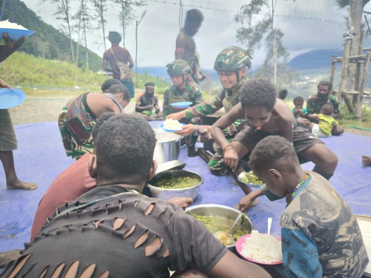 VisualJambi, Sinak – Berbagi kasih dengan sesama dari Satgas Mobile Yonif 323 Buaya Putih dari TK Pintu Jawa melalui kegiatan acara makan siang bersama masyarakat Kampung Megeabume yang bertempat di halaman TK Pintu Jawa, Distrik Sinak, Kabupaten Puncak, Papua Tengah, Selasa (27/08/2024)