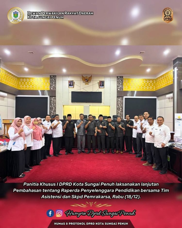 VisualJambi, SUNGAI PENUH – Panitia Khusus I DPRD Kota Sungai Penuh laksanakan lanjutan Pembahasan tentang Raperda Penyelenggara Pendidikan bersama Tim Asistensi dan Skpd Pemrakarsa, Rabu (18/12).