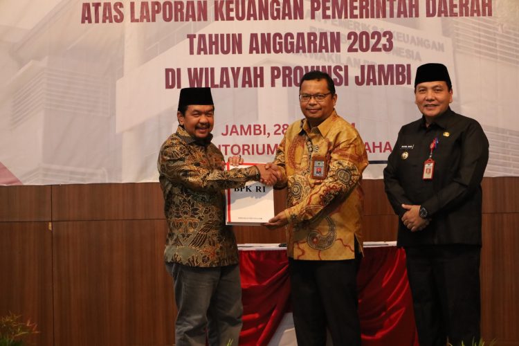 BPK Perwakilan Provinsi Jambi pada hari ini (28/5) menyerahkan Laporan Hasil Pemeriksaan (LHP) atas Laporan Keuangan Pemerintah Daerah (LKPD) Tahun Anggaran (TA) 2023 kepada dua PemerintahcDaerah di Provinsi Jambi yaitu Pemerinta Kota Sungai Penuh dan Pemerintah Kabupaten