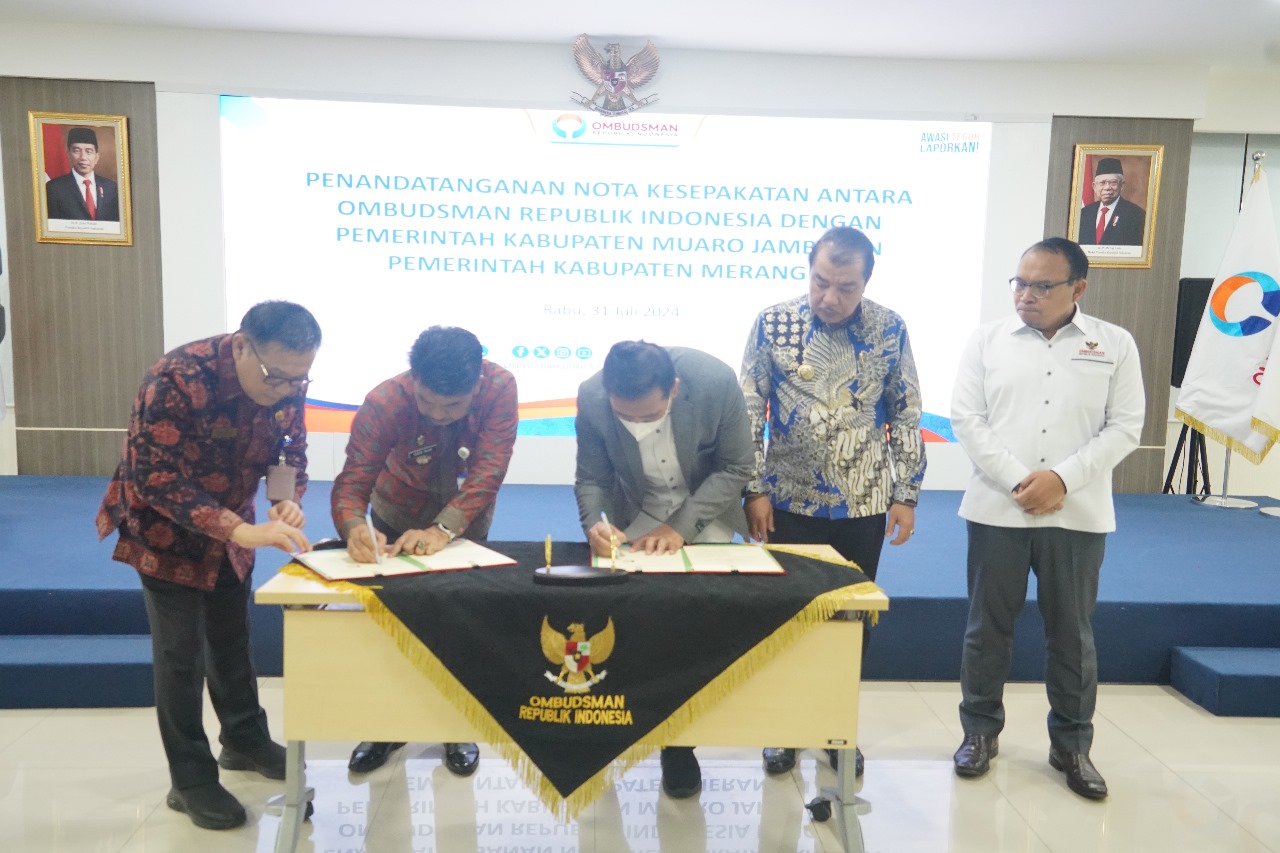 Nota Kesepakatan ini ditandatangani langsung oleh Ketua Ombudsman RI, Mokh Najih beserta Pj. Bupati Merangin Mukti Said dan Pj. Bupati Muaro Jambi Raden Najmi. Kegiatan dilaksanakan di Kantor Pusat Ombudsman RI pada Rabu, 31 Juli 2024.