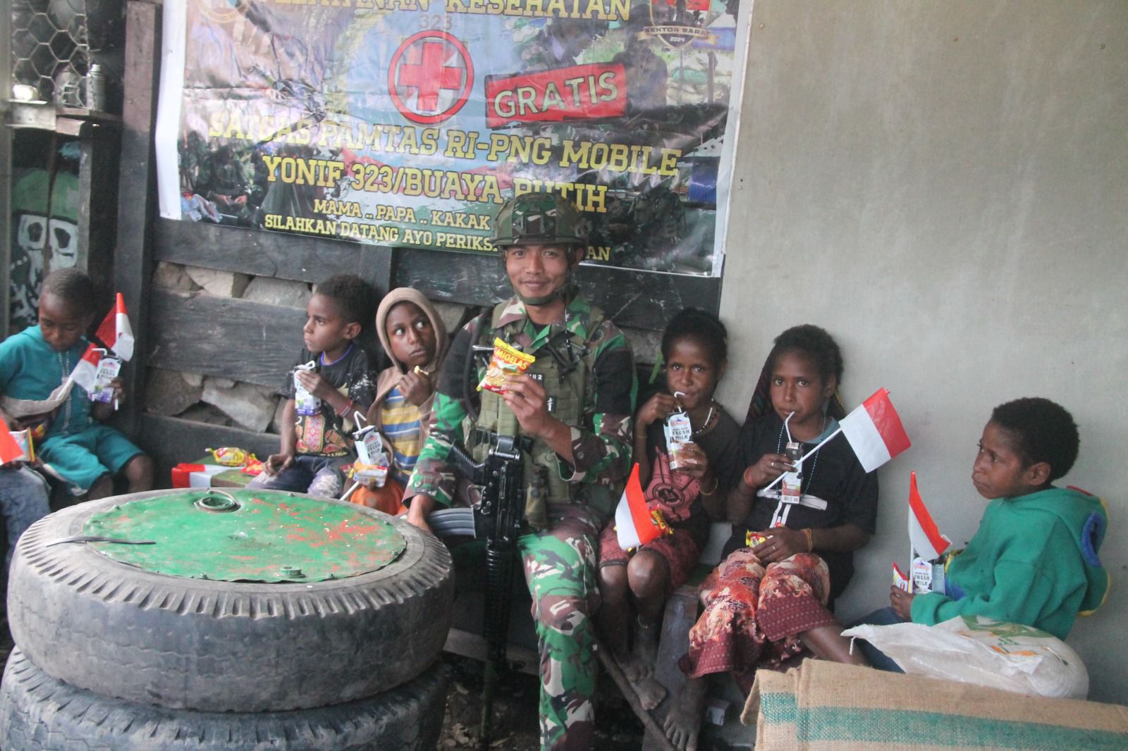 Anak-anak mendatangi pos untuk mengajak bermain personel pos satgas Yonif 323 Buaya Putih, karena merasa senang dengan kehadiran abang-abang dari pos satgas Yonif 323 Buaya Putih.