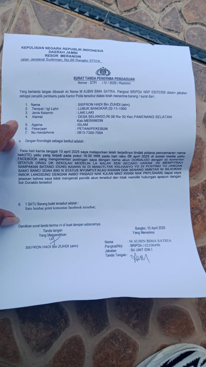 “Benar, saya telah melaporkan pemilik akun Facebook inisial Do ke Polres Merangin terkait dugaan pencemaran nama baik melalui media elektronik,” ujarnya.